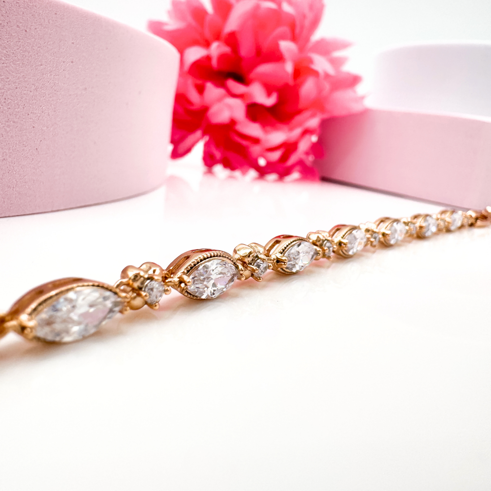 Gefertigt aus einer hochwertigen Legierung und veredelt mit einer roségoldfarbenen Beschichtung, bietet das Armband eine hervorragende Haltbarkeit und einen funkelnden, langlebigen Glanz. Die sorgfältig eingefassten Steine reflektieren das Licht in faszinierender Weise und sorgen für ein luxuriöses Finish.