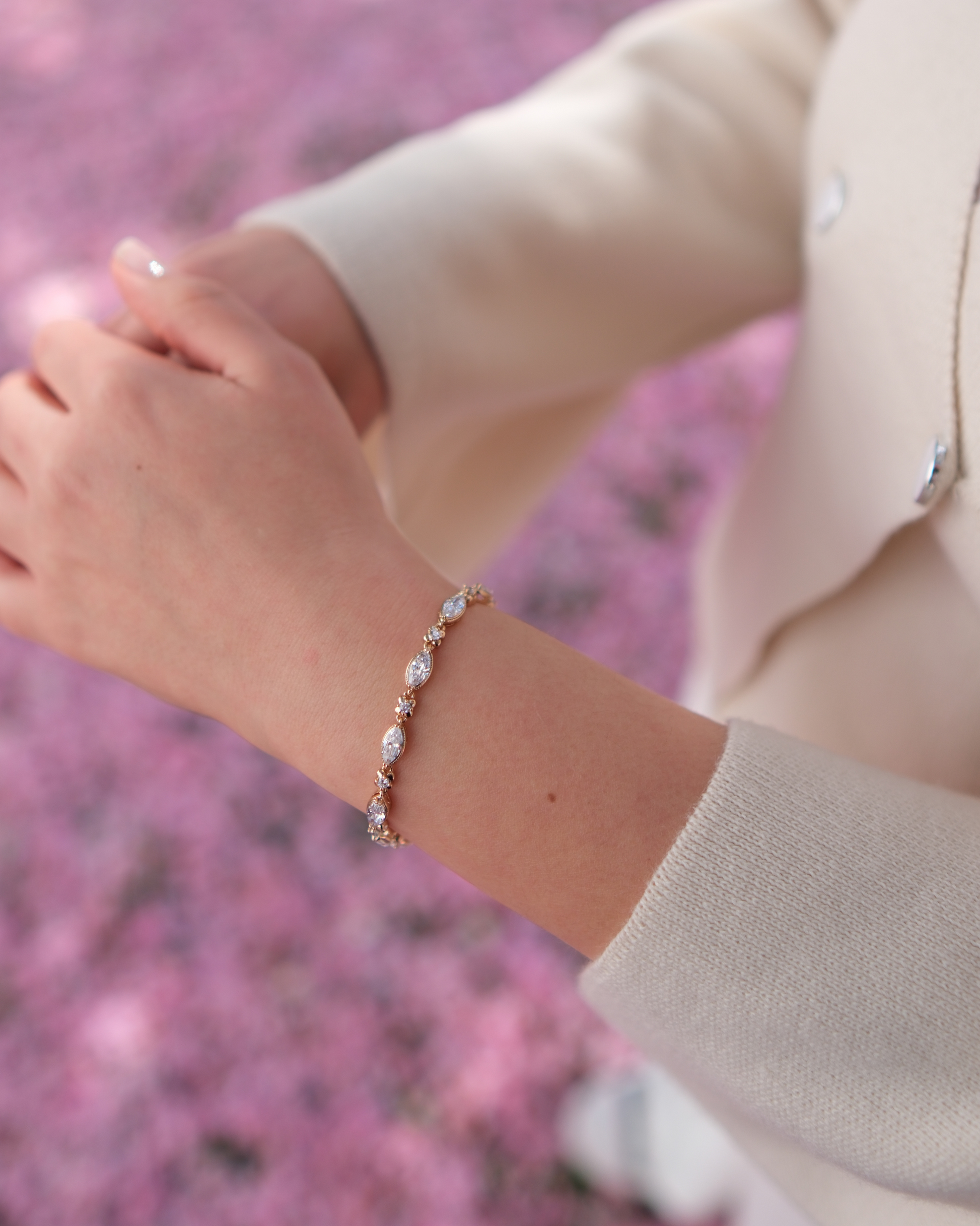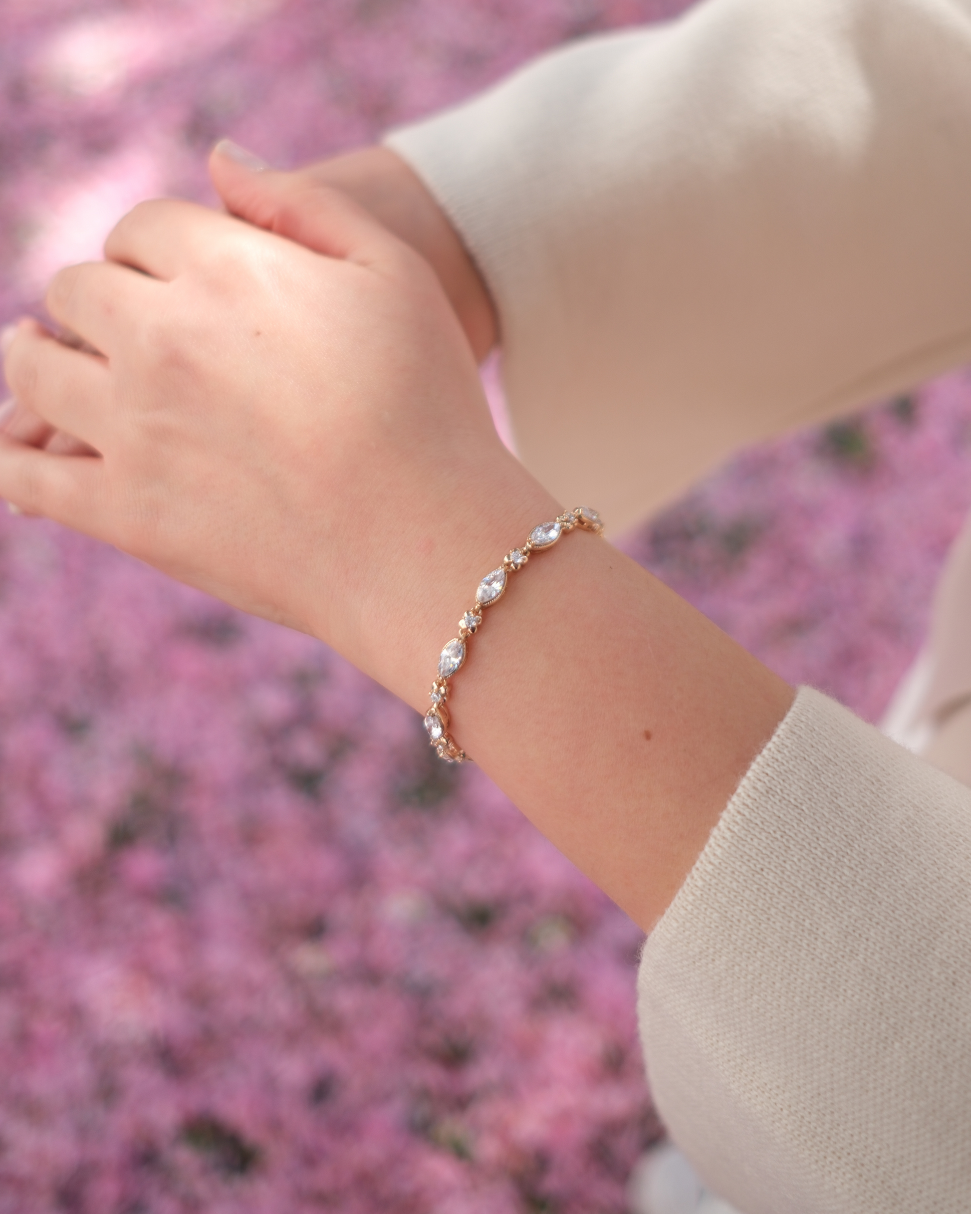 Das Brilliant Bliss Armband vereint filigranes Design mit einer unvergleichlichen Eleganz. Die Kombination aus tropfenförmigen und runden Steinen, eingefasst in einem roségoldfarbenen Rahmen, macht dieses Schmuckstück zu einem wahren Blickfang. Perfekt für Damen, die nach einem Armband suchen, das sowohl Glamour als auch einen Hauch von Zartheit vermittelt.