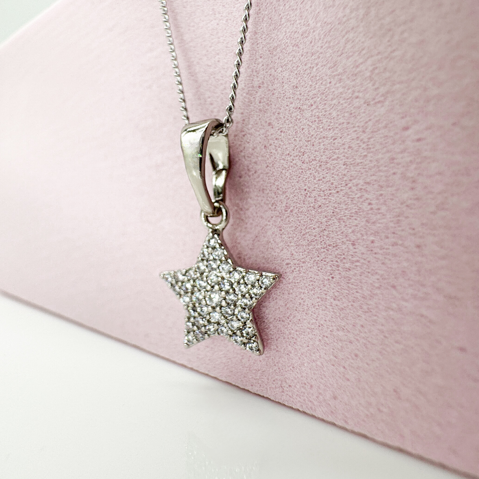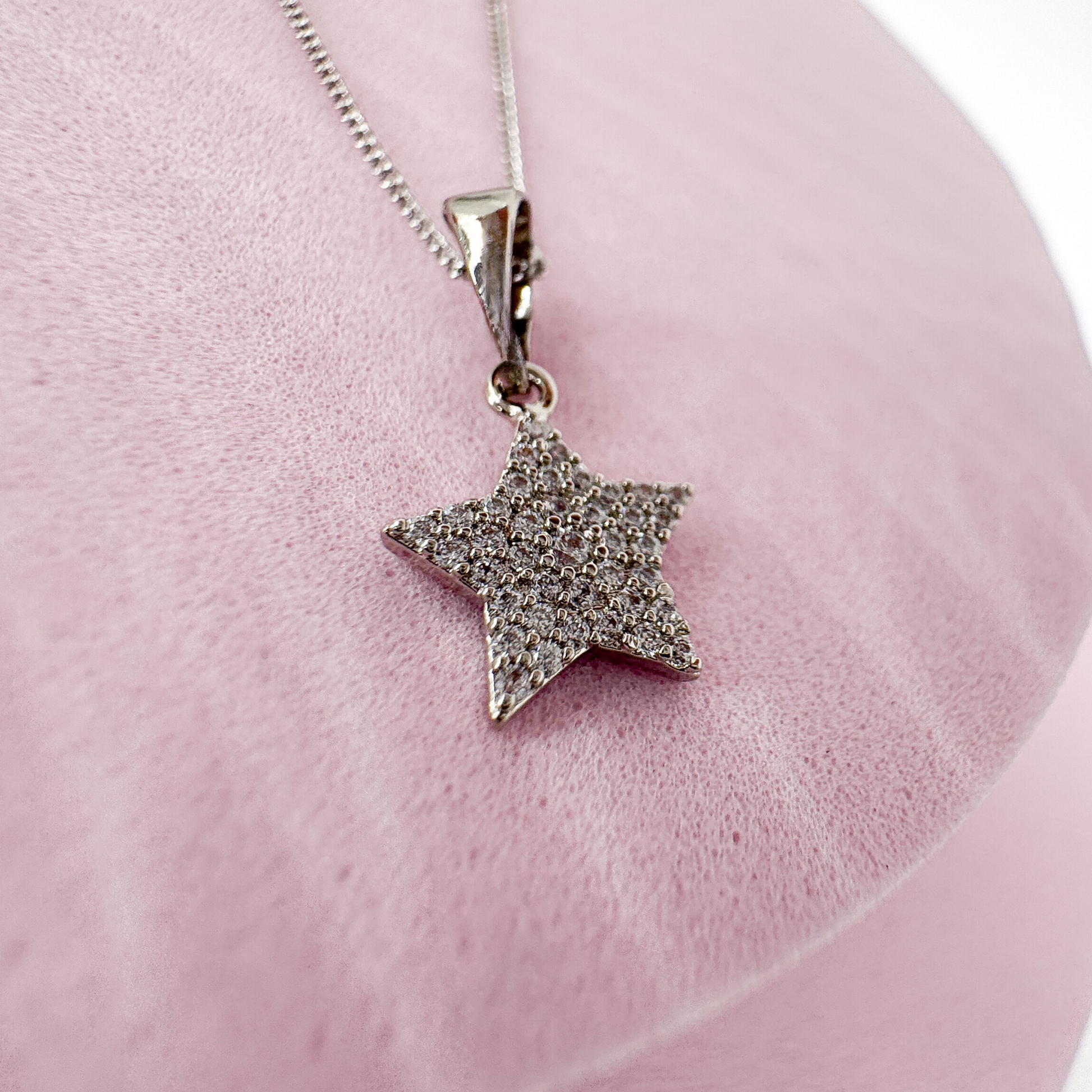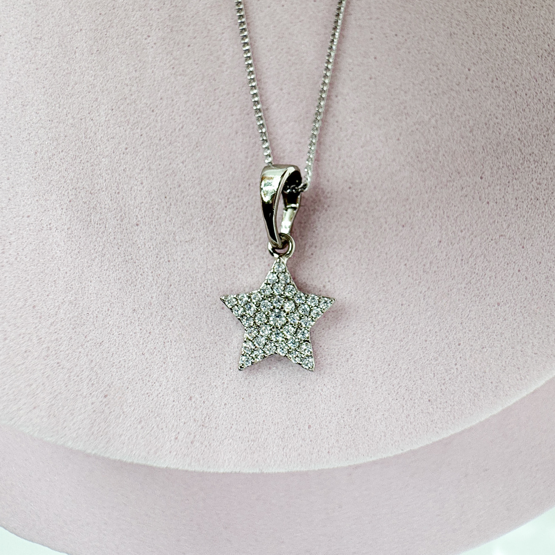 - Design: Sternförmiger Anhänger mit glitzernden weißen Steinen für funkelnde Lichtreflexe