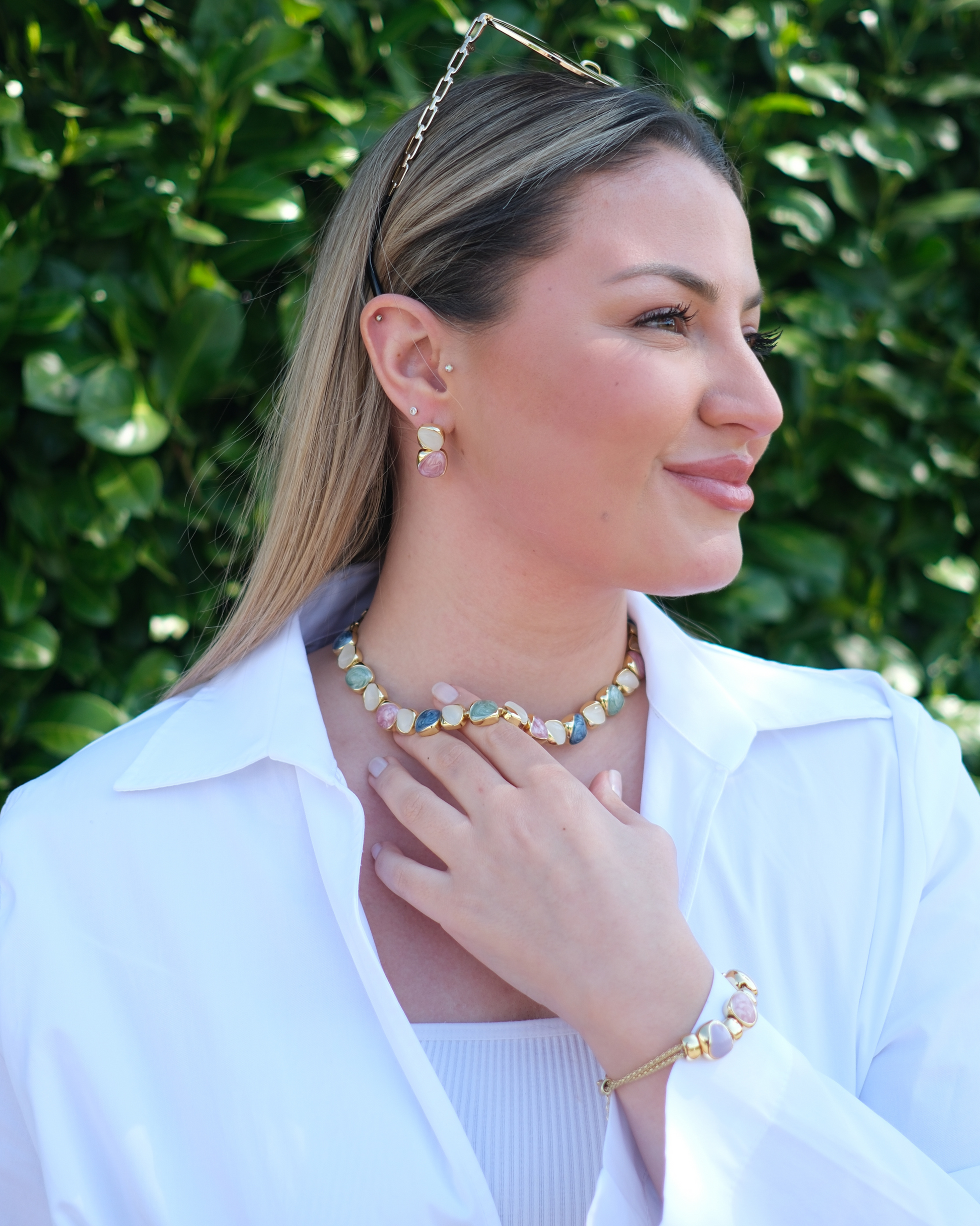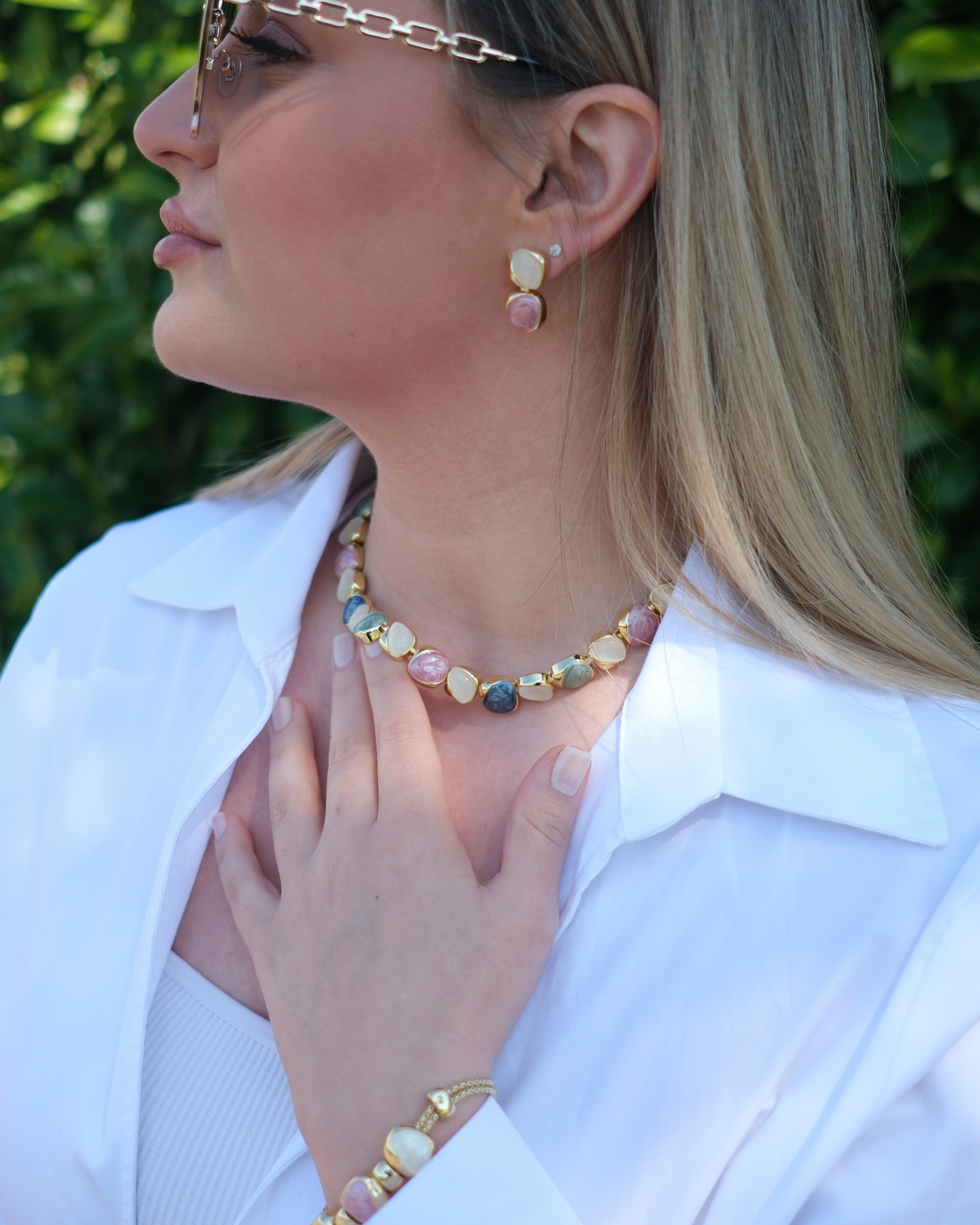 Die CHARMIQ Premium Halskette „Golden Blossom“ vereint zarte Eleganz mit femininer Leichtigkeit. Die goldfarbene Basis harmoniert perfekt mit den sanft marmorierten Schmucksteinen in Pastelltönen wie Rosa, Creme, Lila und Blau – inspiriert von der natürlichen Schönheit blühender Blütenblätter. Die organisch geformten Elemente setzen stilvolle Akzente und machen diese Halskette zu einem echten Blickfang.