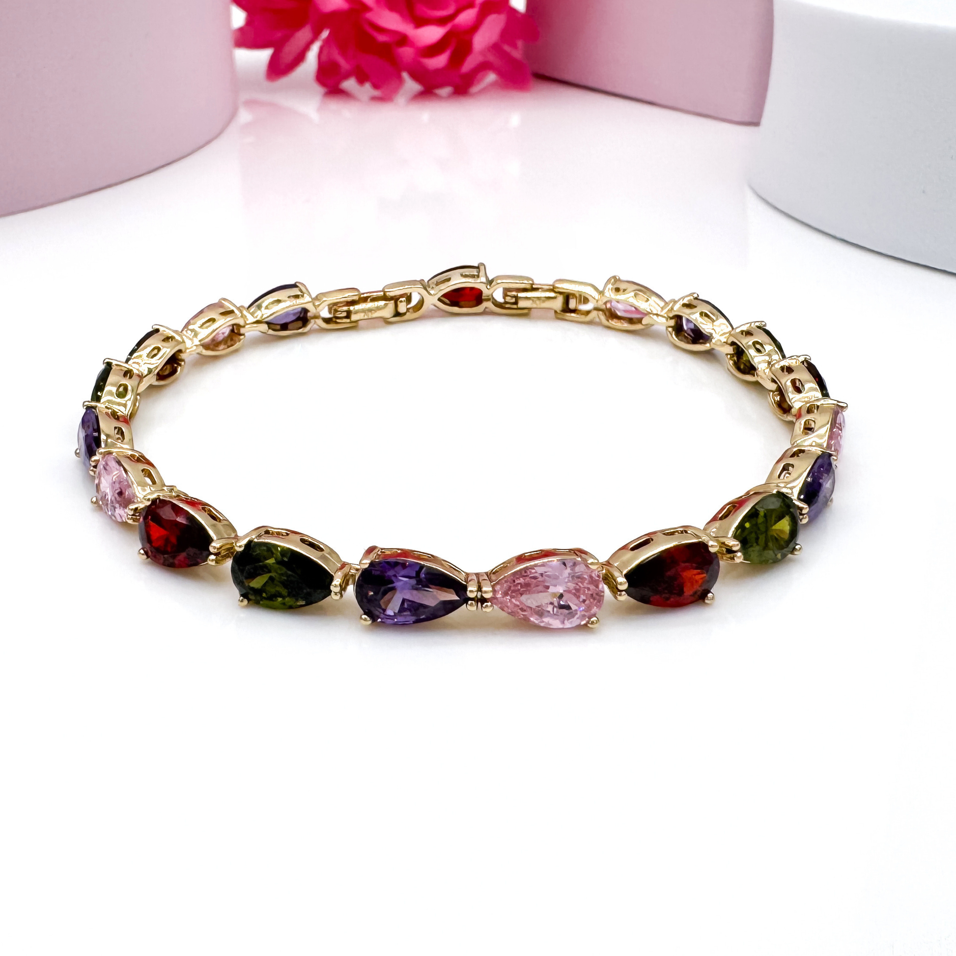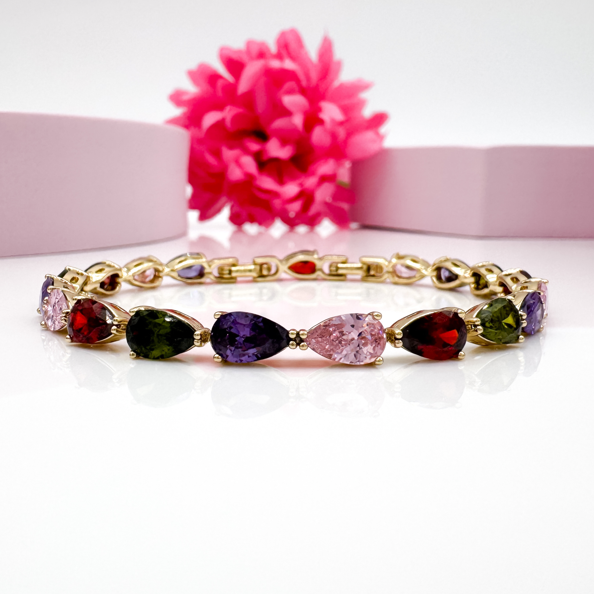 Das Ethereal Twinkle Armband verzaubert mit seinem goldfarbenen Design und den leuchtenden, farbigen Steinen, die ein magisches Funkeln erzeugen. Die Kombination aus goldfarbenen Fassungen und schillernden Farbtönen macht dieses Schmuckstück zu einem eleganten und lebendigen Accessoire, das sich perfekt für besondere Anlässe oder als stilvolles Detail im Alltag eignet.