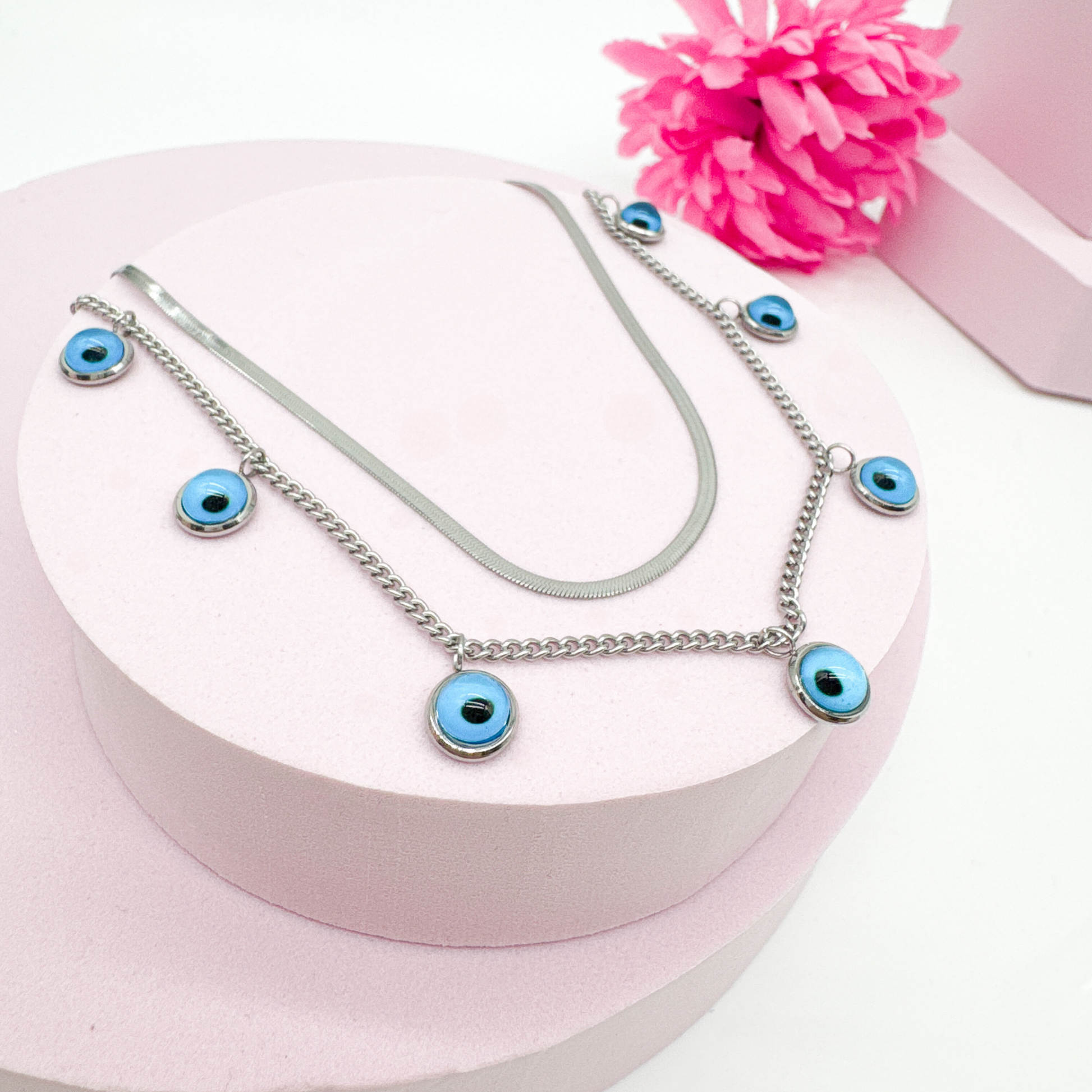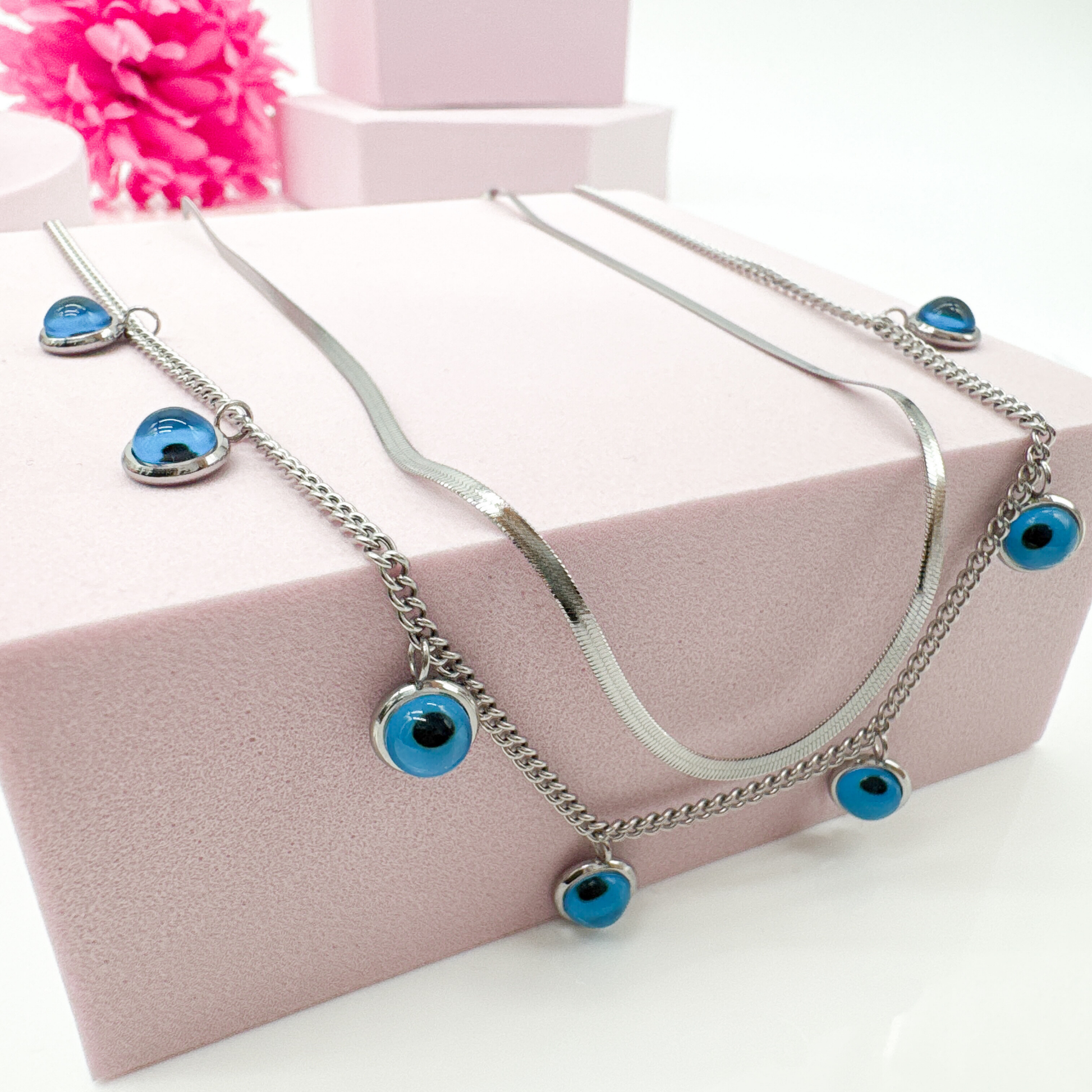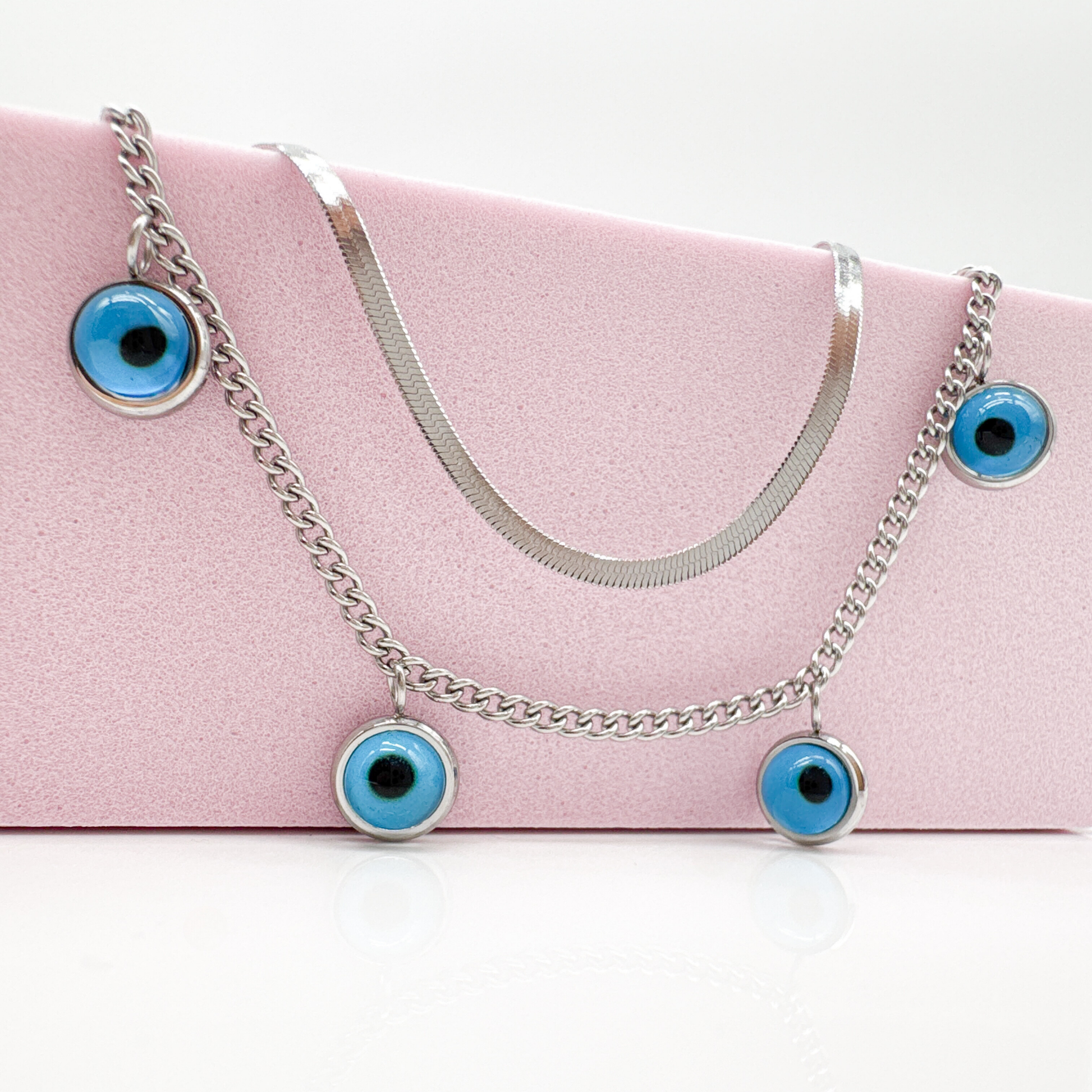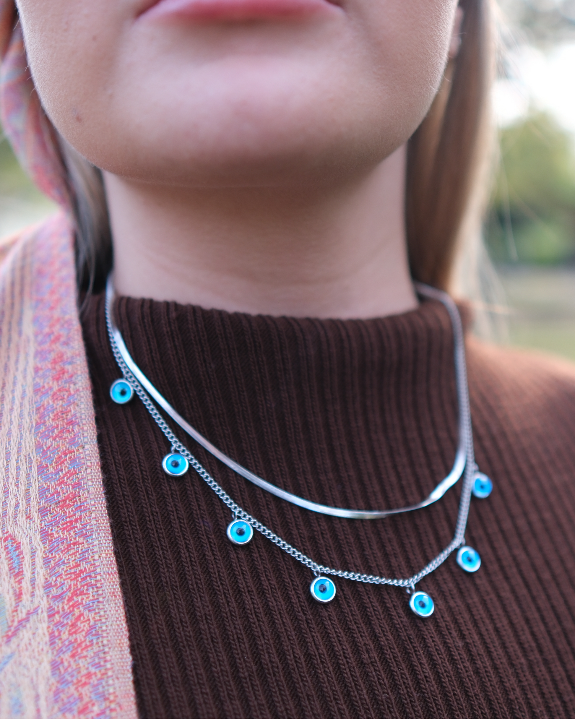 Diese Halskette ist ein stilvolles Schmuckstück, das Tradition und modernes Design vereint. Diese silberfarbene Zweier-Halskette ist mit insgesamt sieben Nazar Boncuk (türkisch: nazar gözü boncuğu – das „Auge des Schutzes“) versehen. Die blauen Schutzaugen-Anhänger sind nicht nur ein dekoratives Highlight, sondern auch ein Symbol für Schutz und positive Energie, das seit Jahrhunderten in verschiedenen Kulturen geschätzt wird.