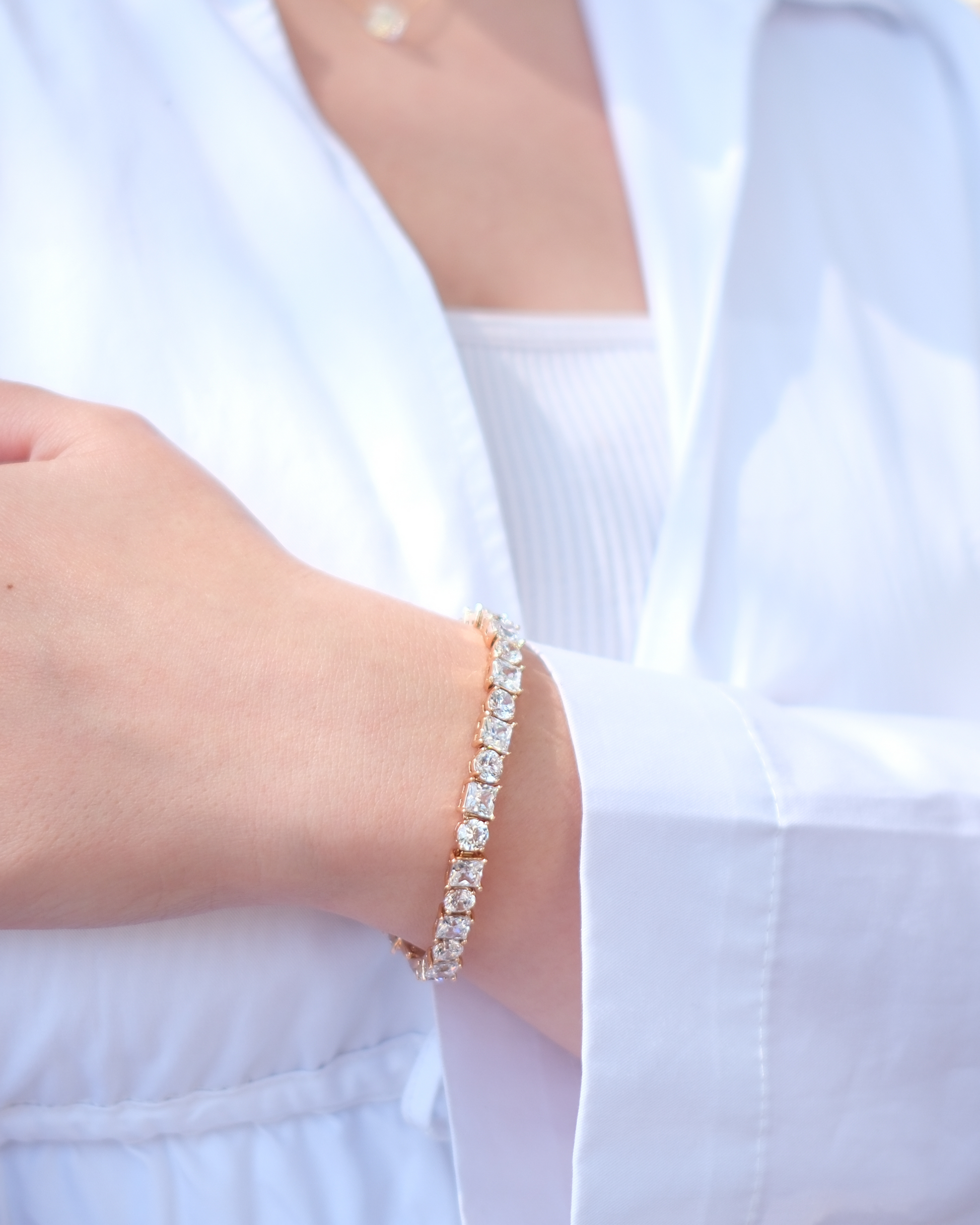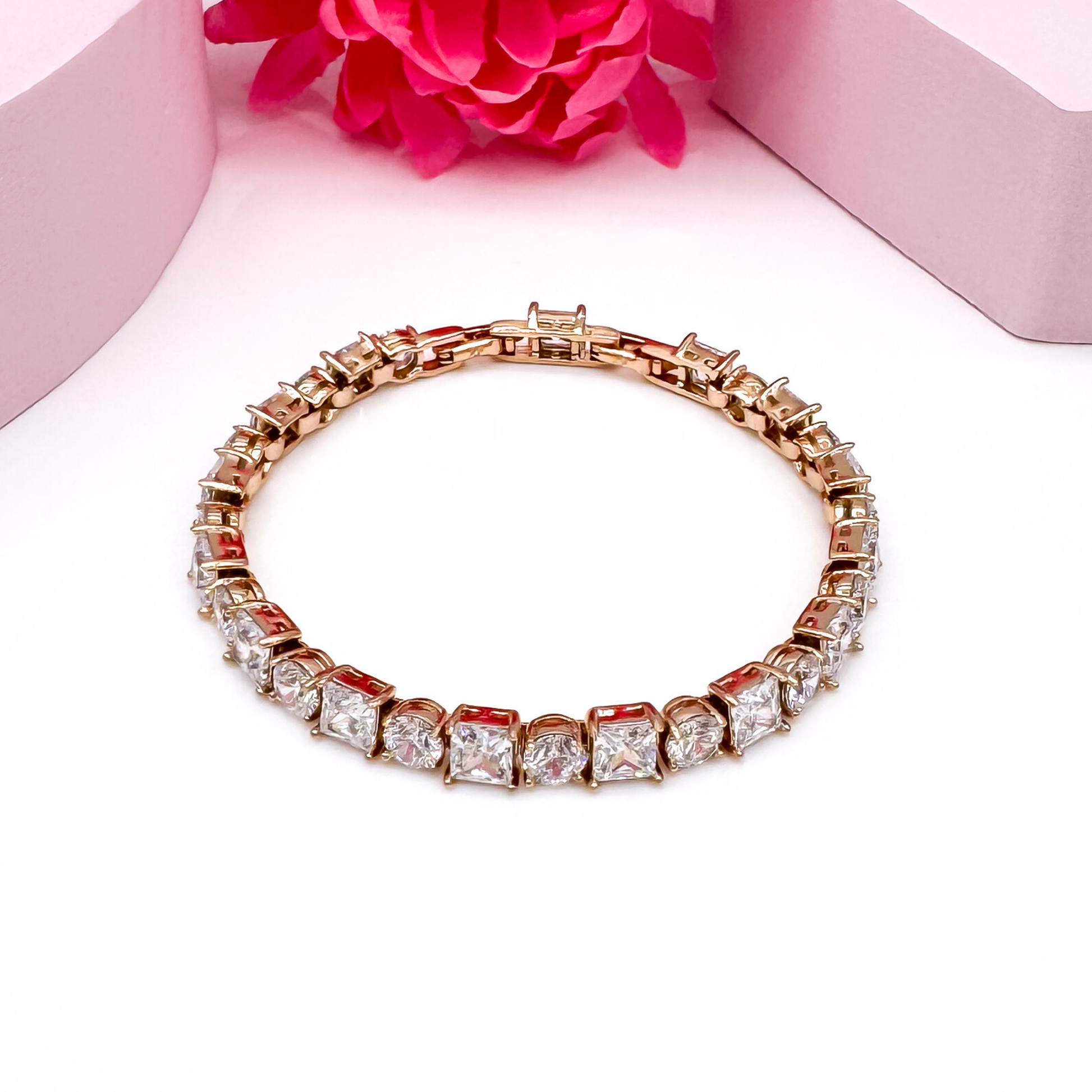 Das Gleaming Aura Armband bezaubert mit seinem luxuriösen Design und den perfekt geschliffenen Zirkonia-Steinen, die ein unvergleichliches Funkeln erzeugen. Die goldfarbene Basis unterstreicht die zeitlose Eleganz des Armbands und macht es zu einem exquisiten Begleiter für Damen, die sich von ihrer strahlendsten Seite zeigen möchten.