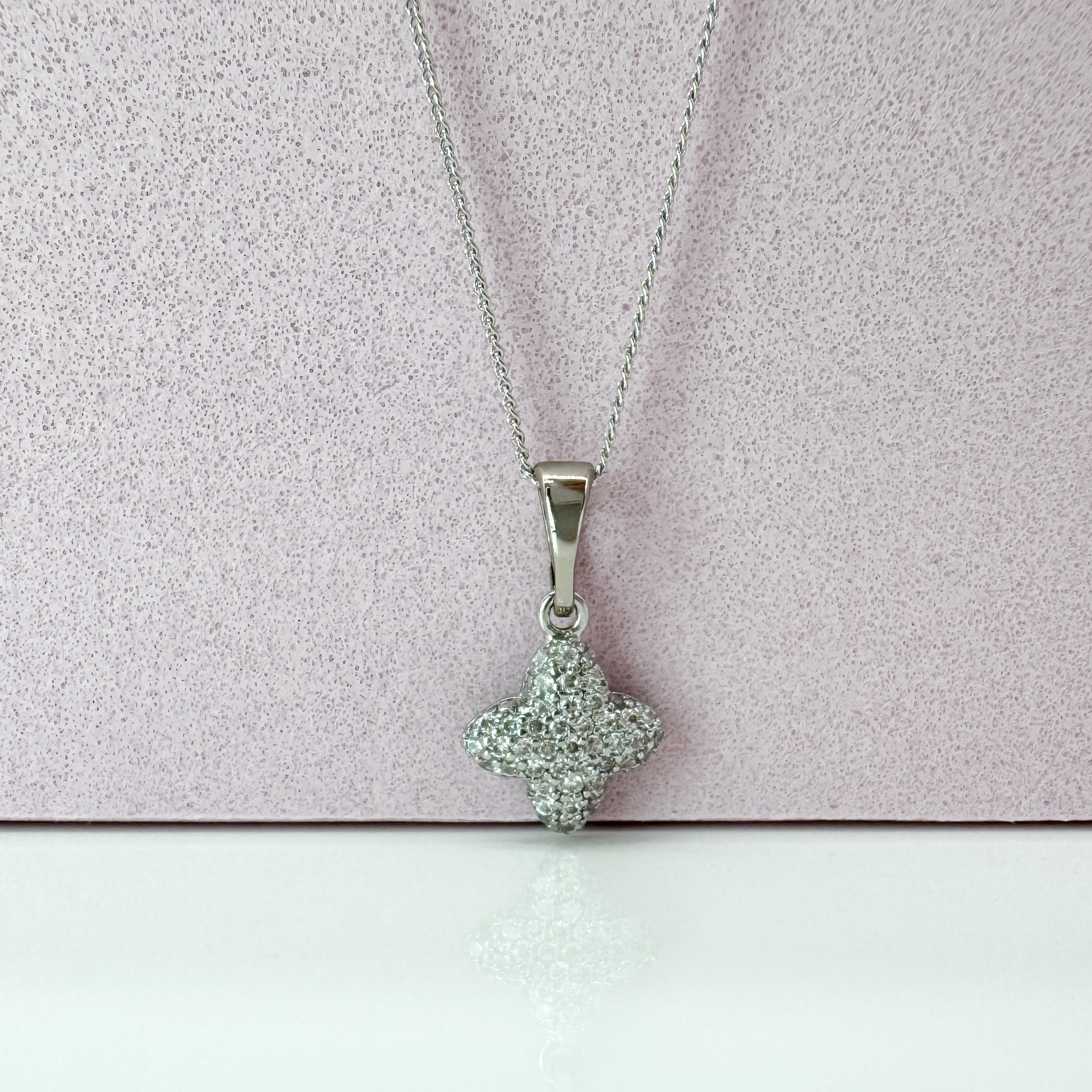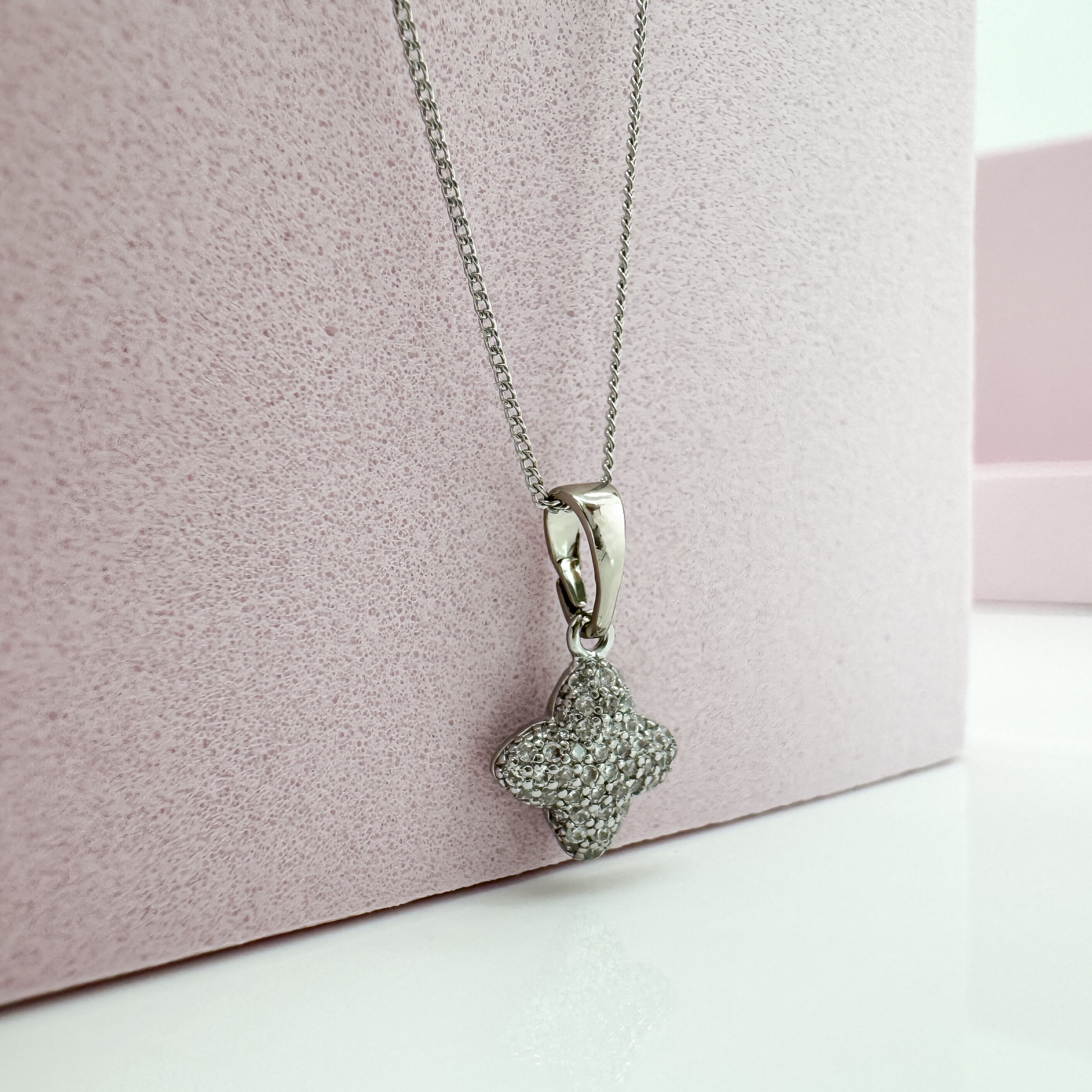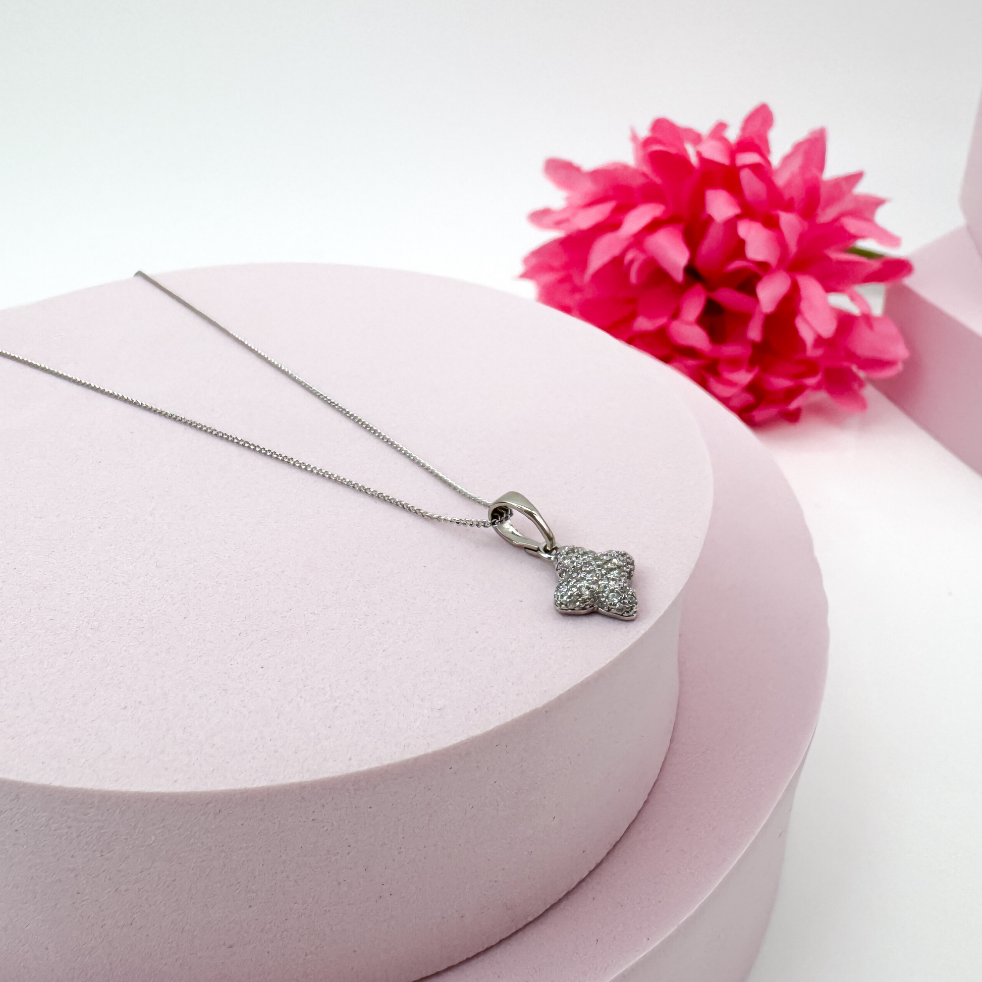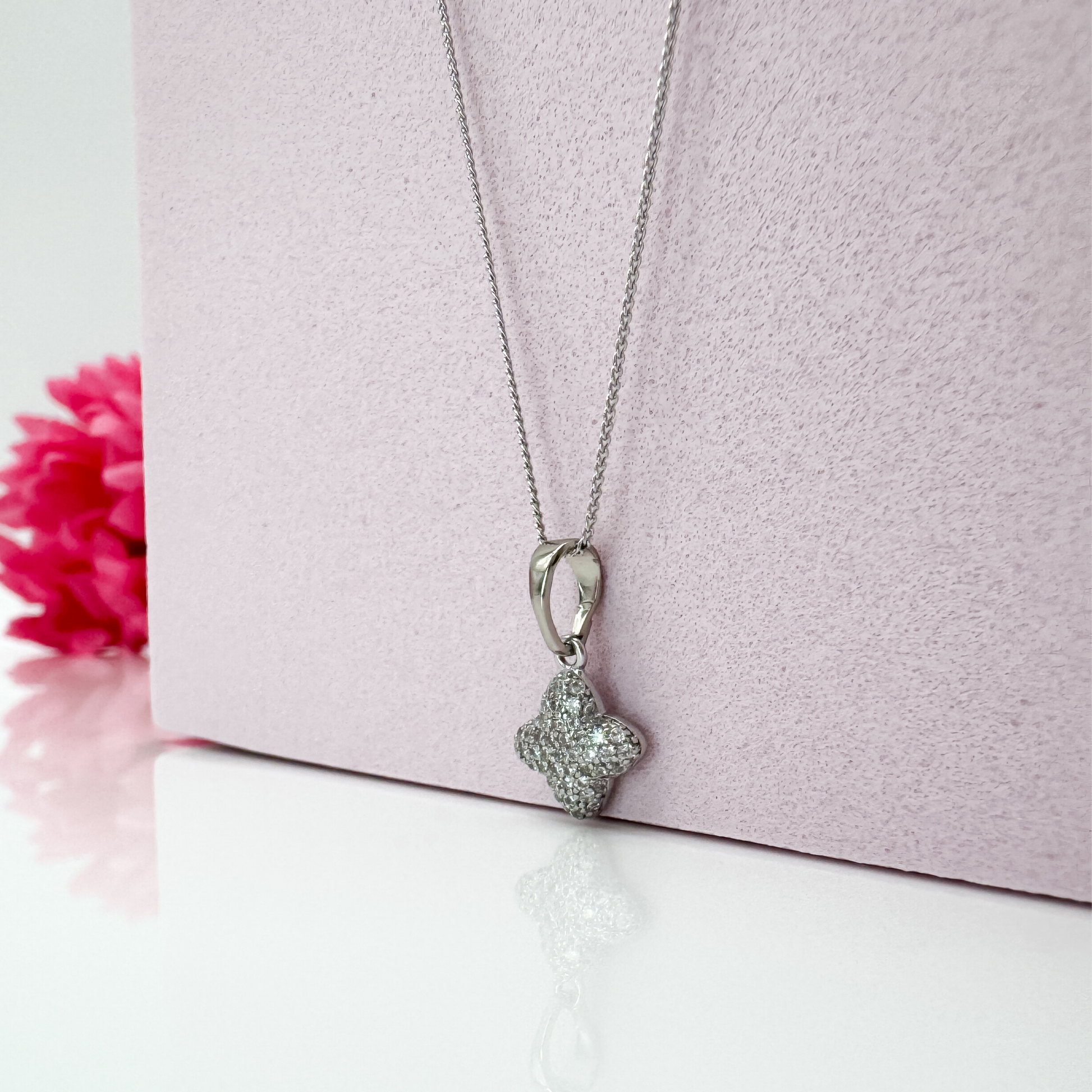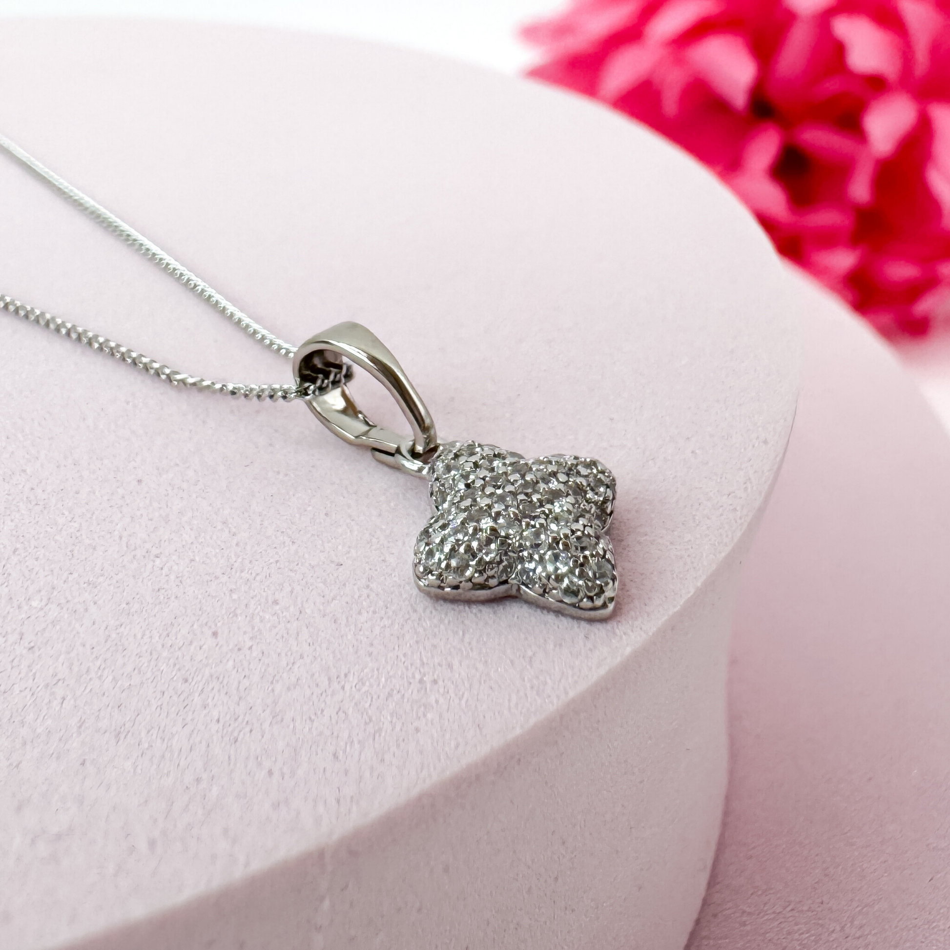 - Design: Anhänger in vierblättriger Kleeblatt-Form mit weißen Steinen
