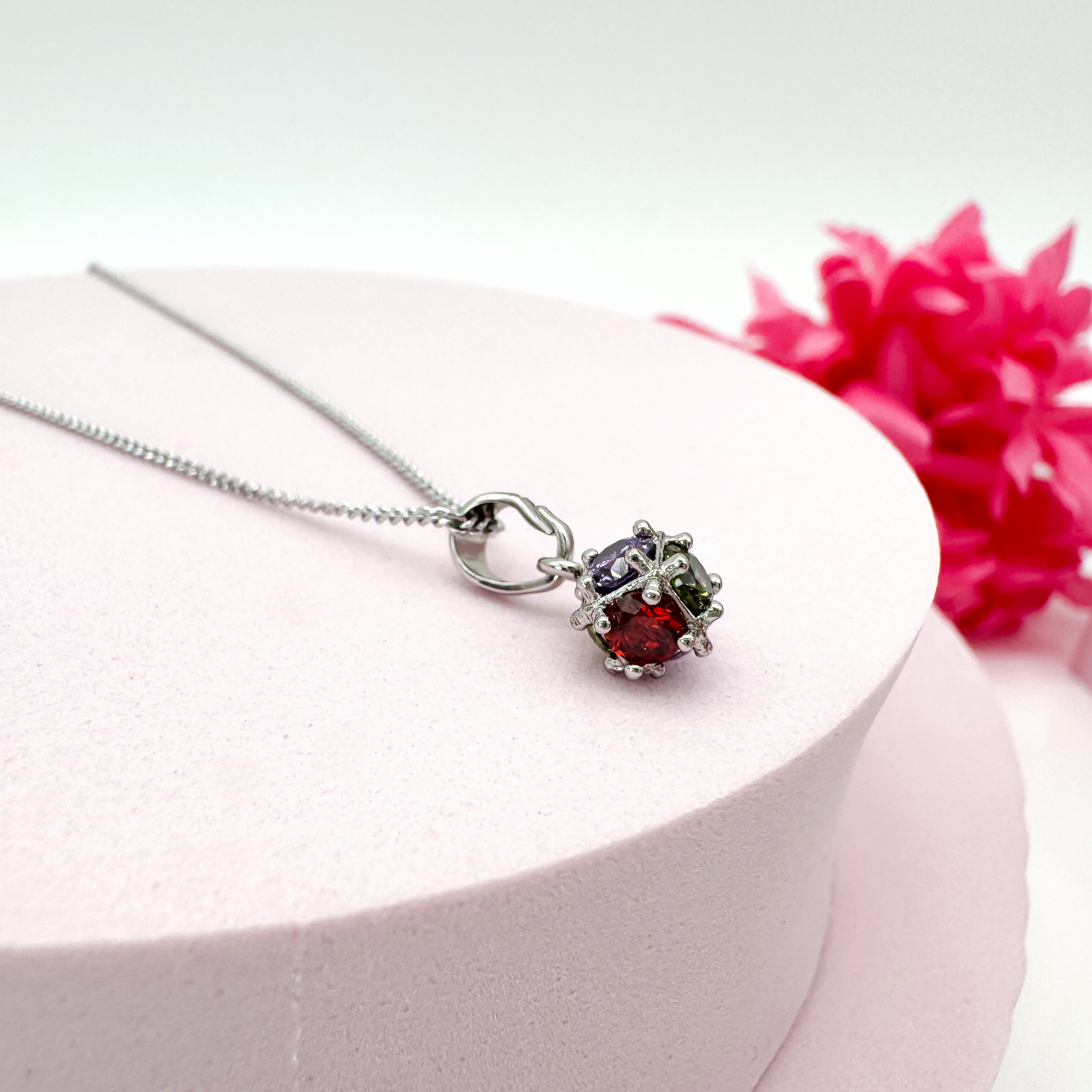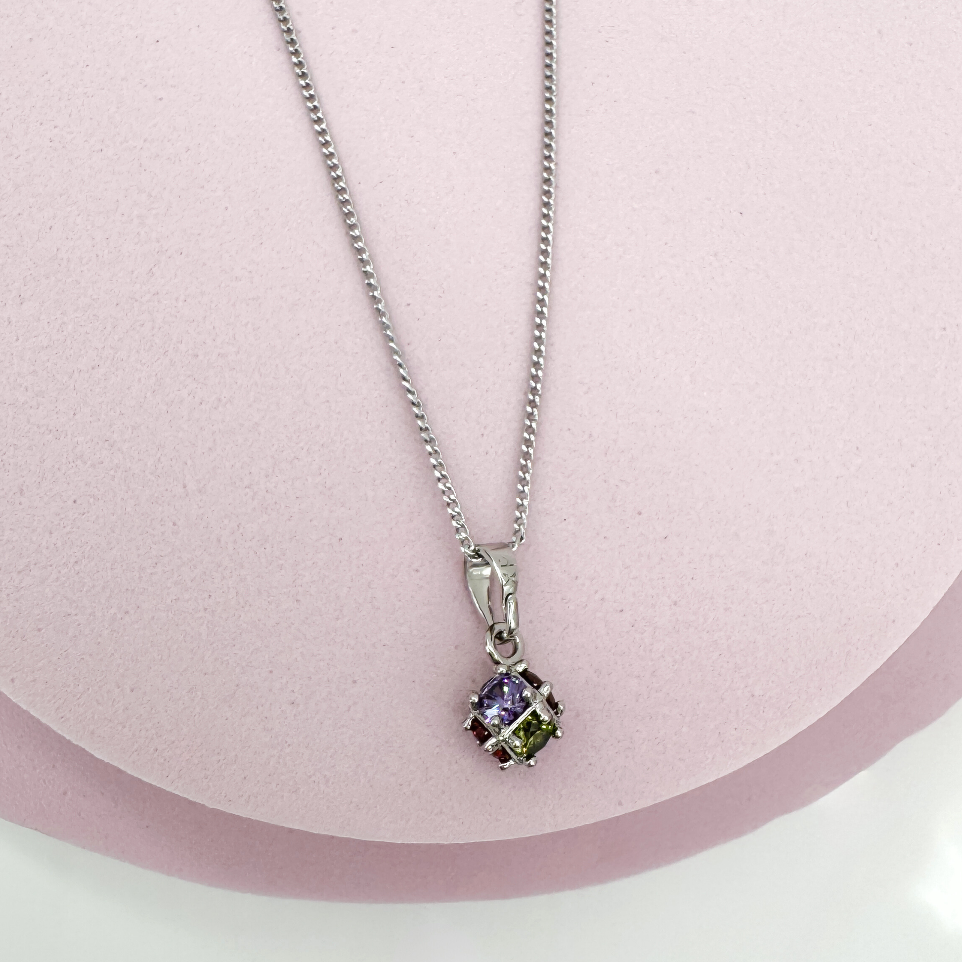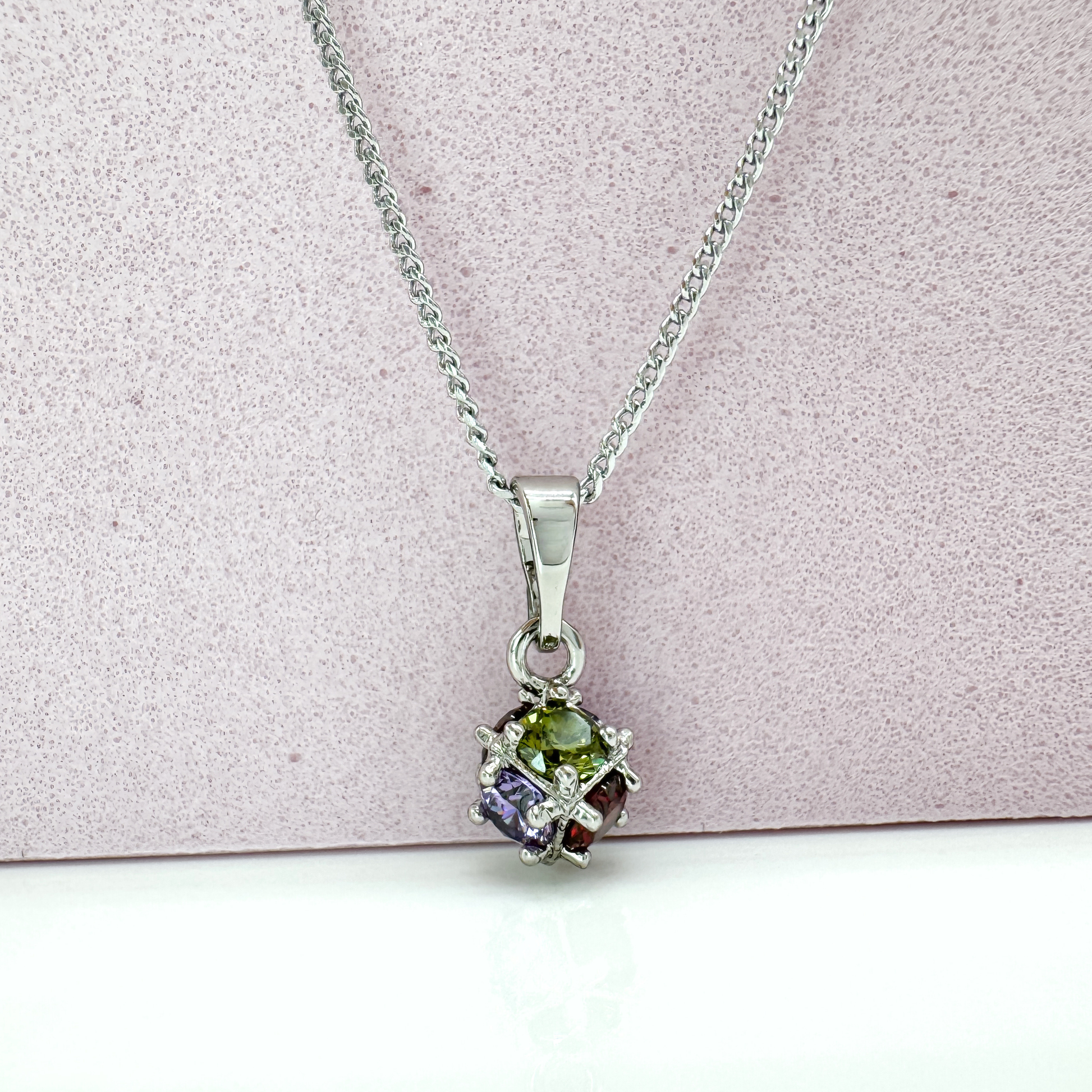 Eine elegante Halskette in silberfarben mit einem kugelförmigen Anhänger aus funkelnden, farbigen Steinen. Die Prisma Aurora Élégance Kette kombiniert luxuriöse Eleganz mit modernem Design. Der kunstvoll gestaltete, kugelförmige Anhänger ist mit präzise gefassten Steinen in verschiedenen Farben verziert und schafft so ein faszinierendes Farbspiel, das an das Schimmern eines Prismas erinnert.