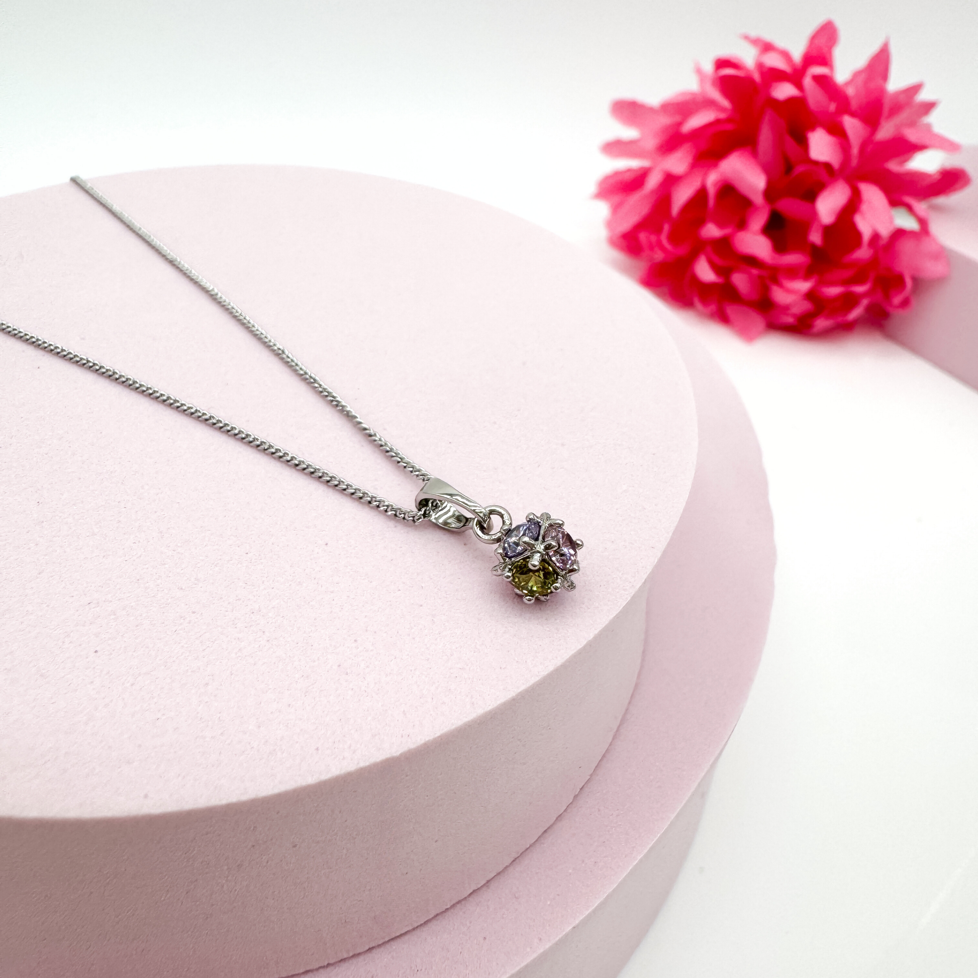 Eine elegante Halskette in silberfarben mit einem kugelförmigen Anhänger aus funkelnden, farbigen Steinen. Die Prisma Aurora light Kette kombiniert luxuriöse Eleganz mit modernem Design. Der kunstvoll gestaltete, kugelförmige Anhänger ist mit präzise gefassten Steinen in verschiedenen Farben verziert und schafft so ein faszinierendes Farbspiel, das an das Schimmern eines Prismas erinnert.