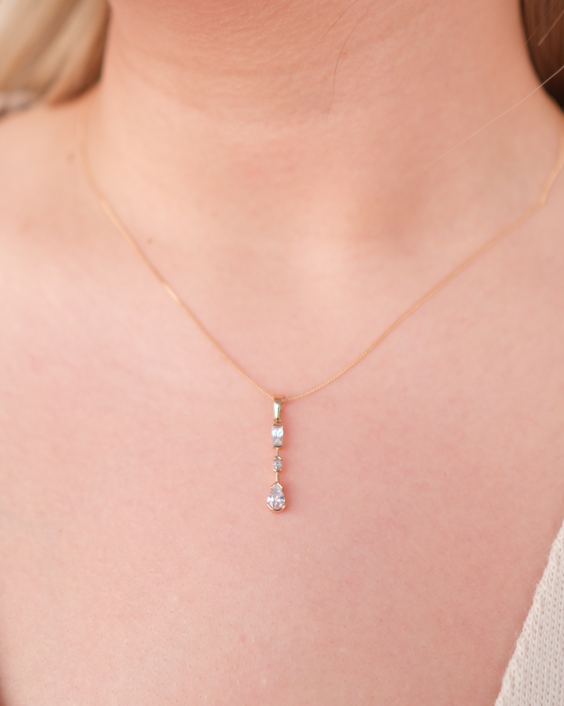 - Länglicher Anhänger mit drei weißen Steinen – dezent und elegant.