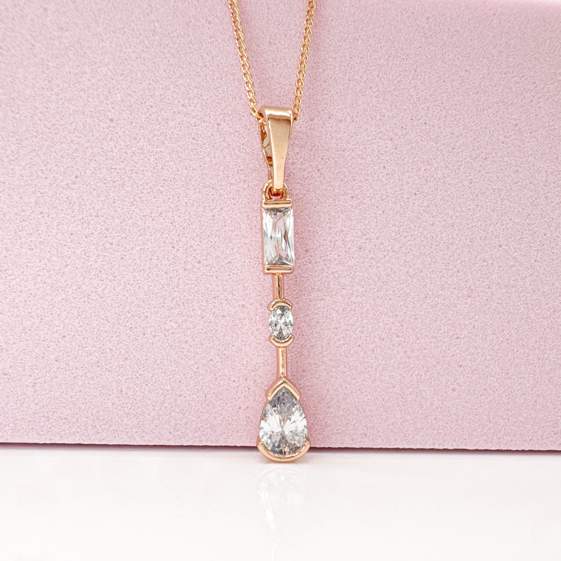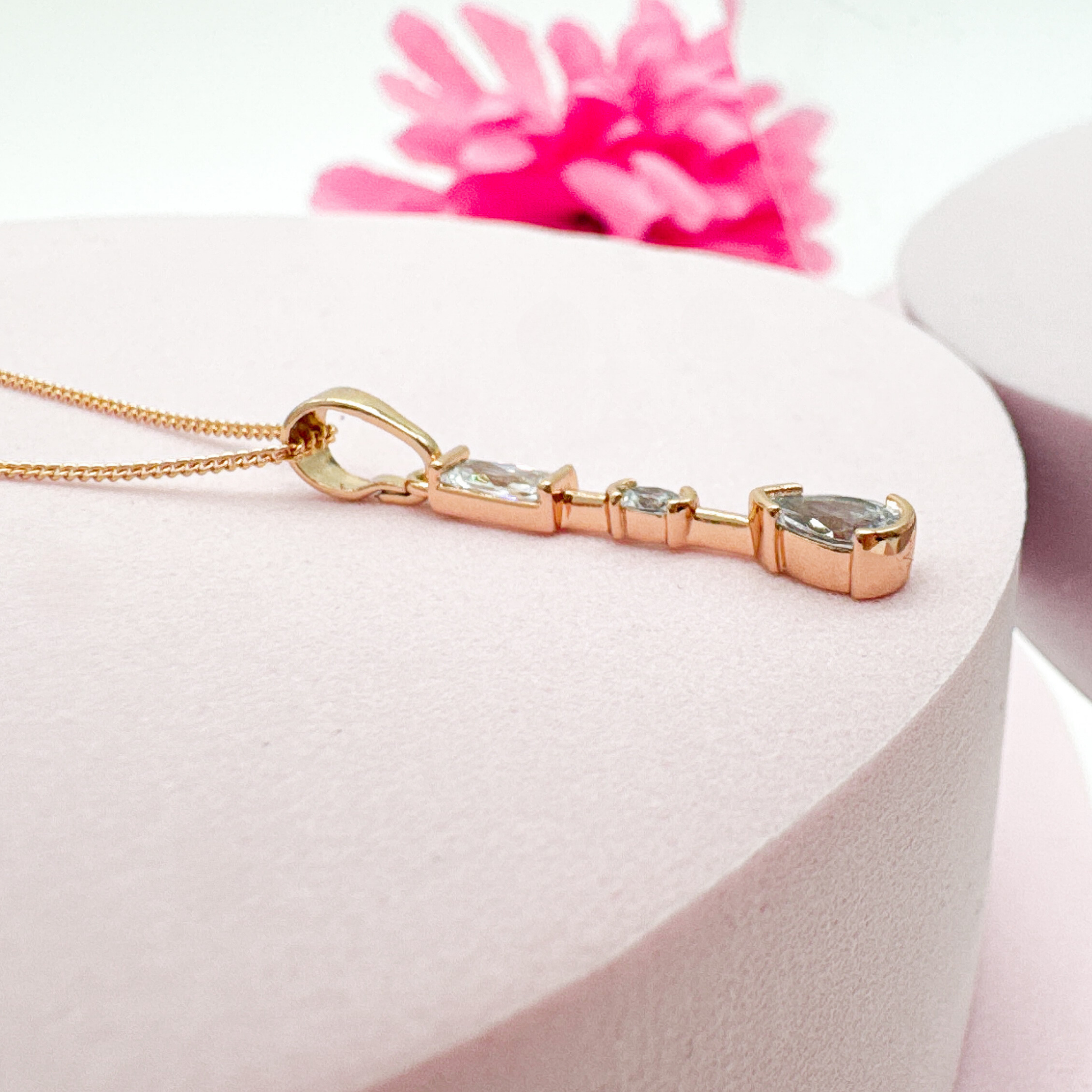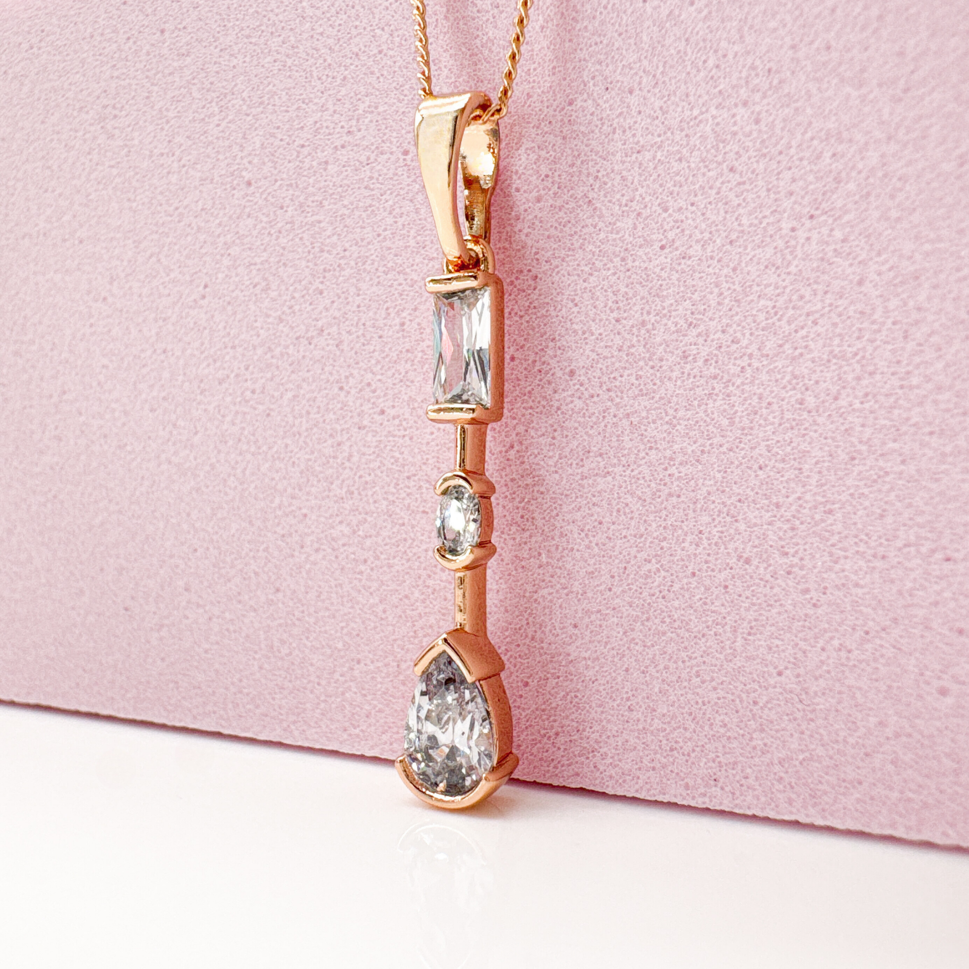 Eine edle Roségolde Kette mit einem eleganten, länglichen Anhänger, der mit drei funkelnden weißen Steinen verziert ist. Dieses Schmuckstück besticht durch seine schlichte Eleganz und seinen dezenten Glanz, der jedem Outfit eine besondere Ausstrahlung verleiht.