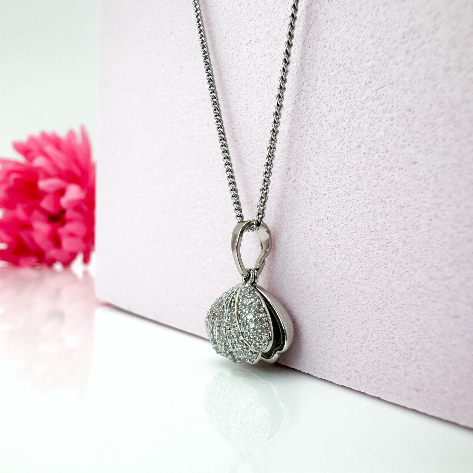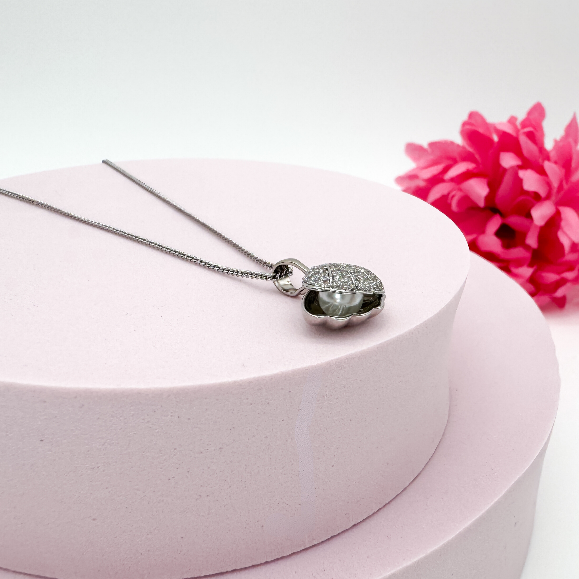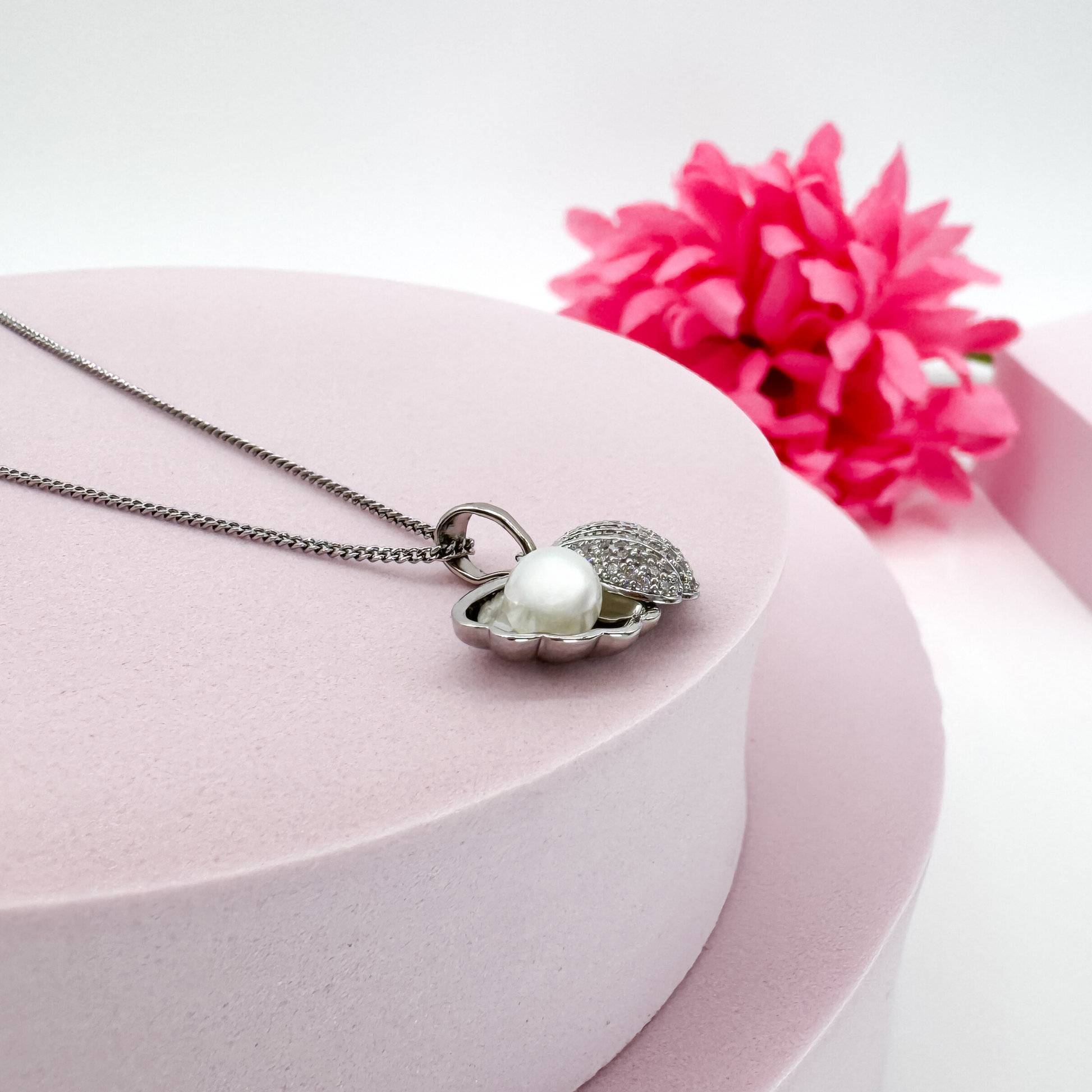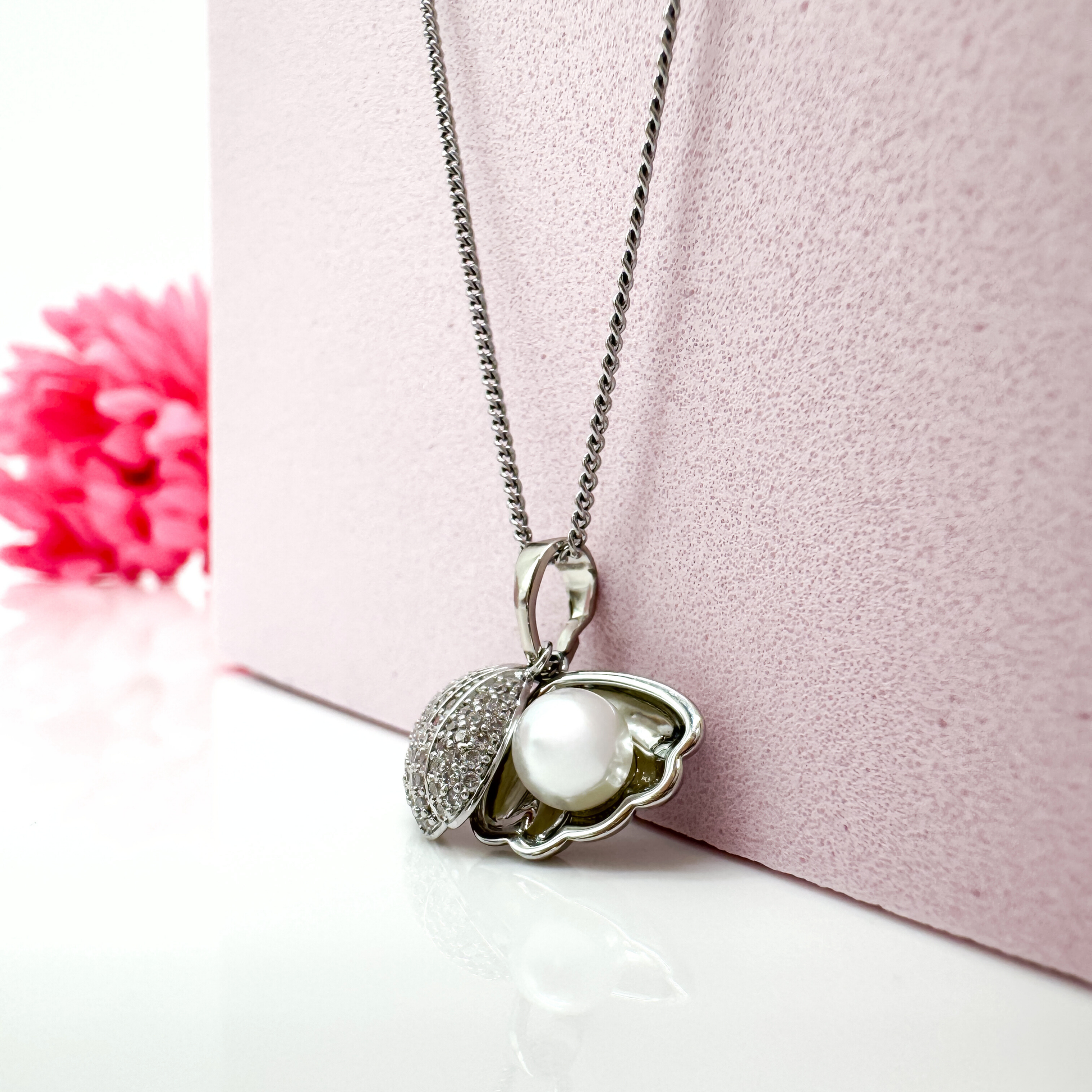 - Aufklappbarer Muschel-Anhänger mit einer eleganten Perle im Inneren.