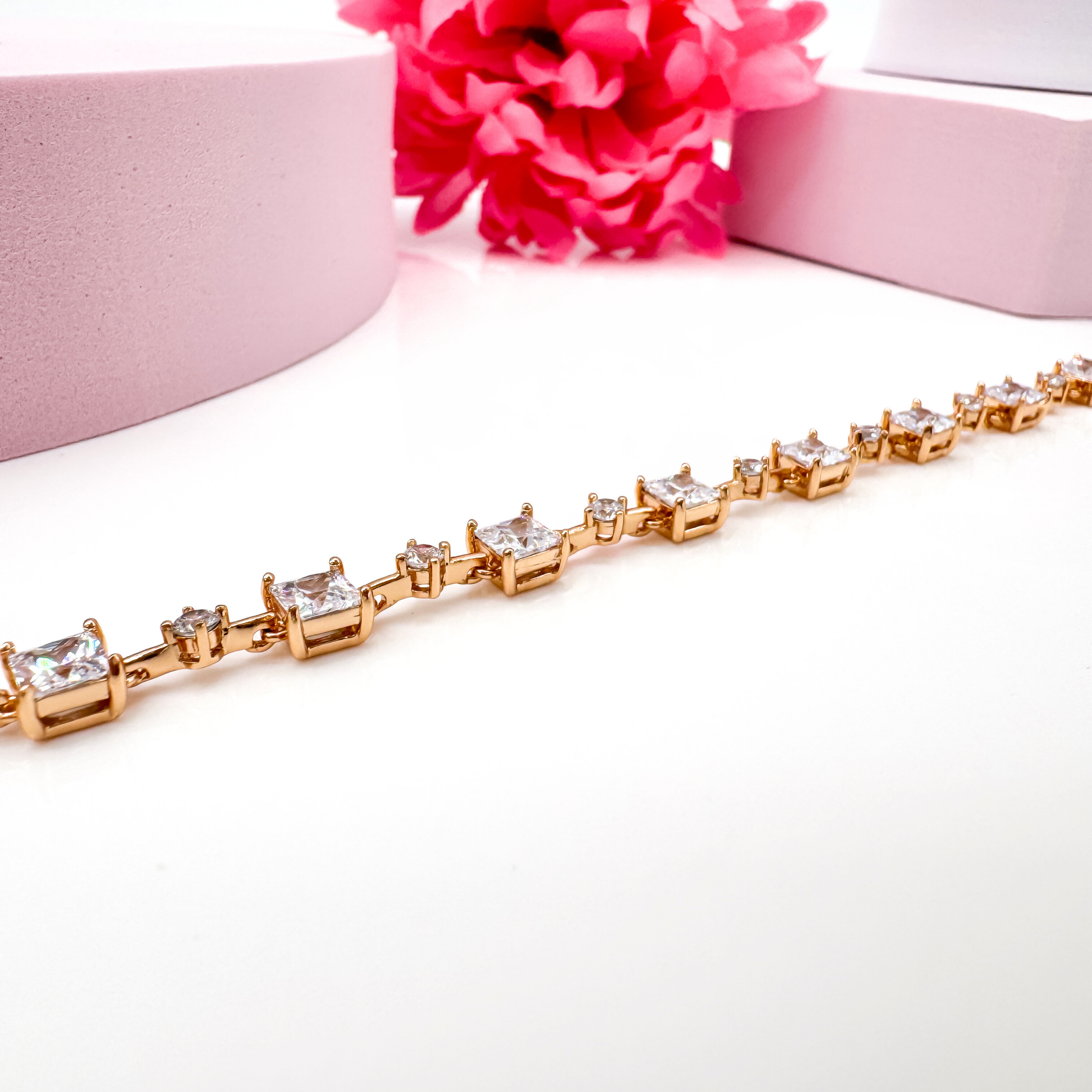 Das Starry Bliss Armband verleiht Ihrem Look einen Hauch von Magie und Eleganz. Die funkelnden, groß-klein wechselnden Reihenfolge der viereckigen Zirkonia-Steine, eingebettet in eine edle roségoldfarbene Basis, machen dieses Schmuckstück zu einem wahrhaft himmlischen Accessoire. Ideal für Damen, die von einem Armband träumen, das schlichte Schönheit mit einem Hauch von Glamour kombiniert.